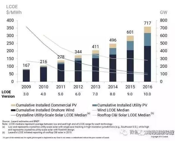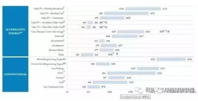中國(guó)儲(chǔ)能網(wǎng)訊:美國(guó)咨詢公司Lazard每年評(píng)估美國(guó)各類能源發(fā)電的全生命周期平準(zhǔn)成本(LCOE),2016年12月15日公布了第10個(gè)LCOE版本。