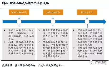 早在1980年代傳統(tǒng)的鋰電池檢測(cè)硬件系統(tǒng)就已經(jīng)面世,之后軟件系統(tǒng)成為傳統(tǒng)鋰電池檢測(cè)系統(tǒng)的重要補(bǔ)充,促進(jìn)了鋰電池檢測(cè)系統(tǒng)行業(yè)的發(fā)展。90年代隨著鋰電池應(yīng)用范圍進(jìn)一步擴(kuò)大,檢測(cè)技術(shù)快速發(fā)展,激活二次電池的化成設(shè)備開(kāi)始規(guī)?;霈F(xiàn)。2010年之后新能源汽車和儲(chǔ)能應(yīng)用產(chǎn)品在國(guó)際范圍快速發(fā)展,行業(yè)進(jìn)入高速發(fā)展期,鋰電池檢測(cè)系統(tǒng)行業(yè)涌現(xiàn)出工況模擬系統(tǒng)、能量回饋系統(tǒng)和大功率檢測(cè)系統(tǒng)、BMS檢測(cè)等新一代產(chǎn)品,行業(yè)向自動(dòng)化、系統(tǒng)化方向邁進(jìn),并且由離線選擇性測(cè)試向在線必需性測(cè)試轉(zhuǎn)變,需求大幅提升。目前后端設(shè)備形成了圍繞電芯激活化成、分容檢測(cè)以及電池組測(cè)試工藝的一系列設(shè)備。