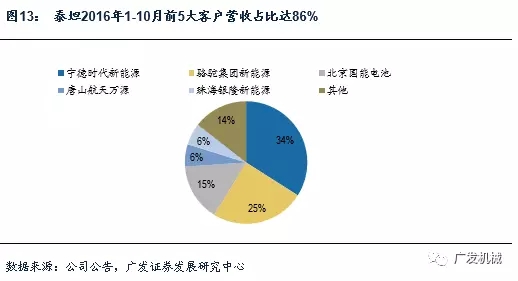 集聚優(yōu)質(zhì)客戶資源,并購(gòu)助理渠道拓展:目前公司的主要客戶有比亞迪股份有限公司、雙登集團(tuán)股份有限公司、 珠海銀隆新能源有限公司、寧德時(shí)代新能源科技股份有限公司、駱駝集團(tuán)新能源 電池有限公司和中航鋰電(洛陽(yáng))有限公司等多家知名鋰電池企業(yè)。隨著先導(dǎo)智能對(duì)泰坦新動(dòng)力的收購(gòu),預(yù)計(jì)未來(lái)可以和先導(dǎo)智能形成上下游的聯(lián)動(dòng)效應(yīng),進(jìn)一步開(kāi)拓優(yōu)質(zhì)客戶資源。