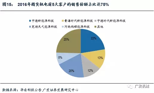 從客戶結(jié)構(gòu)來(lái)看,行業(yè)內(nèi)3家企業(yè)精實(shí)機(jī)電(華自科技擬收購(gòu))、泰坦新動(dòng)力(先導(dǎo)智能收購(gòu))、瑞能股份2016年前5大客戶占比大都在70-85%(先導(dǎo)同期為59%),是鋰電生產(chǎn)中客戶集中度最高的環(huán)節(jié)之一。