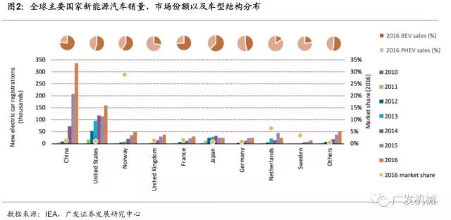 2016年全球新能源汽車銷量創(chuàng)歷史高點(diǎn),總計(jì)超過75萬輛。其中,中國市場的增長尤為明顯,新增數(shù)量高達(dá)33.6萬輛,約為同期美國新能源汽車新增保有量的2倍。歐洲市場新能源汽車2016年新增保有量約為21.5萬輛,新能源汽車的發(fā)展還是集中在以下部分國家,主要包括挪威、英國、法國、德國、荷蘭及瑞典。挪威對新能源汽車的發(fā)展在政策上給予了大力支持,新能源汽車的稅收、道路通行費(fèi)等都有較大程度的減免,使得挪威成為2016年新增汽車數(shù)量中新能源汽車占比最大的國家,占比高達(dá)29%。此外,中國和法國的新能源汽車市場中,純電動(dòng)汽車的占比極大,約為75%。而荷蘭、瑞典及英國以發(fā)展插電式混合動(dòng)力汽車為主。