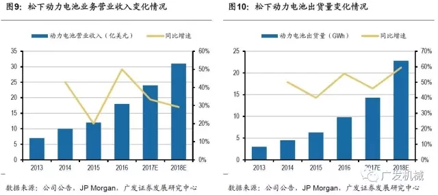 松下電器產(chǎn)業(yè)株式會(huì)社創(chuàng)建于1918年,于1994年開始研發(fā)可充電鋰離子電池。1998年松下開始量產(chǎn)筆記本電腦專用的圓柱形鋰離子電池,并建成了業(yè)內(nèi)領(lǐng)先的鋰離子電池生產(chǎn)線。2008年11月,松下宣布與三洋電機(jī)合并,一躍成為全球最大的鋰電池供應(yīng)商。隨著新能源汽車的興起,松下動(dòng)力電池業(yè)務(wù)營業(yè)收入快速增長,2016年達(dá)18億美元,同比增速約為50%,2016年動(dòng)力電池出貨量約為9.8GWh,同比增速56%。