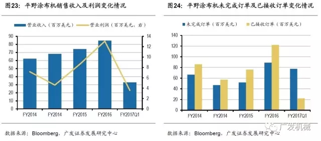 近年來,受益動(dòng)力電池行業(yè)景氣度高漲,平野涂布機(jī)業(yè)務(wù)營業(yè)收入逐年攀升,F(xiàn)Y2017年涂布機(jī)營業(yè)收入8470萬美元,同比增長14%,營業(yè)利潤1306萬美元,同比增長51.4%。此外,動(dòng)力電池企業(yè)持續(xù)擴(kuò)產(chǎn),平野涂布機(jī)在手訂單充裕。