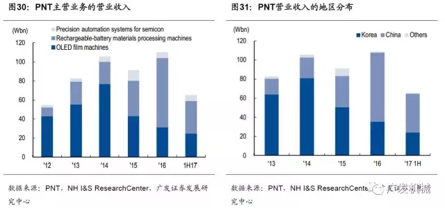 韓國以及全球新能源汽車的發(fā)展帶動(dòng)了韓國三星SDI、LG化學(xué)等動(dòng)力電池企業(yè)的繁榮,作為三星SDI、LG化學(xué)等優(yōu)質(zhì)動(dòng)力電池企業(yè)鋰電設(shè)備的供貨商,PNT鋰電設(shè)備業(yè)務(wù)營業(yè)收入快速增長。從PNT營業(yè)收入的地區(qū)分布來看,中國市場對業(yè)績的貢獻(xiàn)逐年增大,并在2016年首次超過韓國本土。受益新能源汽車中國市場的發(fā)展,2017年上半年,PNT中國市場的營收占比進(jìn)一步擴(kuò)大,達(dá)到了61.9%,