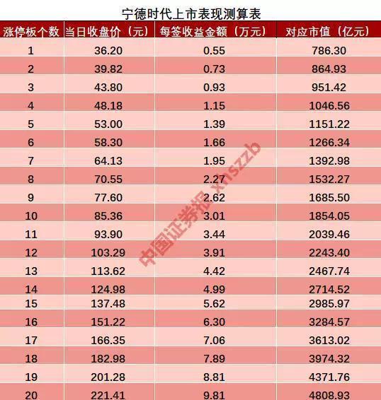 從寧德時(shí)代上市股價(jià)模擬測(cè)算表看,如果收獲10個(gè)漲停板,其每簽收益最高可達(dá)3萬元;若與藥明康德一樣收獲16個(gè)漲停板,每簽收益最高可達(dá)6.30萬元。