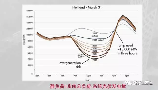 用一個(gè)加州的例子來解釋什么是調(diào)峰。凈負(fù)荷就是負(fù)荷減去當(dāng)時(shí)的光伏發(fā)電量得出的負(fù)荷。上圖2012年那根線就是凈負(fù)荷的線,本來的負(fù)荷很高,但是加州的光伏發(fā)電量相當(dāng)高,用負(fù)荷減去光伏的發(fā)電量,就會(huì)出現(xiàn)圖中的形狀,在中午時(shí)分是下凹的,那是因?yàn)橹形鐣r(shí)光伏發(fā)電量特別高;下午五點(diǎn)時(shí),凈負(fù)荷的線非常直非常陡地沖上去。熟悉電力系統(tǒng)的人都知道,電力系統(tǒng)的負(fù)荷高峰有兩個(gè)時(shí)段,一個(gè)是早上八九點(diǎn)左右,第二個(gè)是下午五六點(diǎn)鐘。下午五六點(diǎn)開燈開空調(diào)的人多,負(fù)荷上升,但是五六點(diǎn)光伏是在下降的,所以上升的負(fù)荷減去下降的光伏,導(dǎo)致凈負(fù)荷在兩個(gè)小時(shí)之內(nèi)非常陡的上升,這對(duì)電力系統(tǒng)有很大的沖擊性,要做到非常難。所以擺在電力公司面前的問題就是,每年光伏電量增加那么多,到2030年圖上的那根線會(huì)越來越下降,五點(diǎn)鐘上升的那根線會(huì)越來越陡(這就是加州經(jīng)常所說的“鴨子曲線”)。
