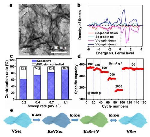 圖1. (a) 超薄VSe2納米片的透射電鏡圖;(b) VSe2的投影態(tài)密度圖;(c) 不同掃速下的電容貢獻(xiàn)百分比圖;(d) VSe2納米片的倍率性能圖;(e) 超薄VSe2納米片中可逆儲(chǔ)存K+的示意圖。