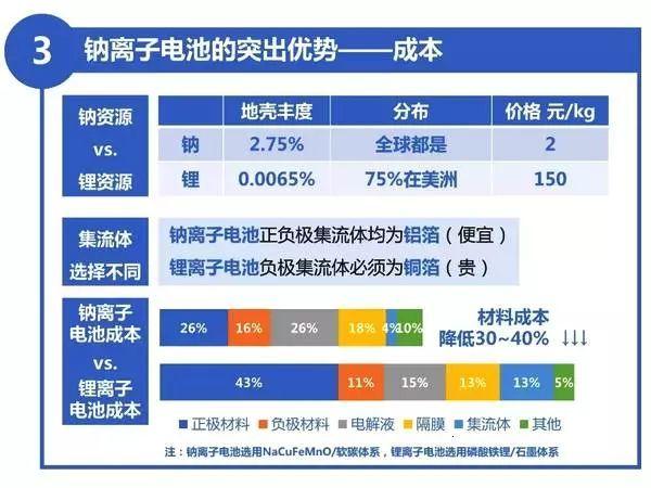 該體系選用資源豐富的鈉作為活性元素,正負(fù)極材料分別選用成本低廉的鈉銅鐵錳氧化物和無煙煤基軟碳,從而具備了明顯的成本優(yōu)勢。目前鈉離子電池的能量密度已達(dá)到120瓦時/公斤,是鉛酸電池的3倍左右。低成本鈉離子電池有望在低速電動車、電動船、家庭儲能、電網(wǎng)儲能等領(lǐng)域獲得應(yīng)用。