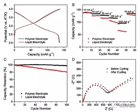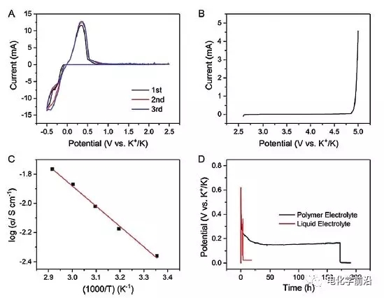 同時(shí)為抑制鉀枝晶的生成,研究人員引入交聯(lián)型PMMA為基礎(chǔ)的凝膠聚合物電解質(zhì),該復(fù)合電解質(zhì)可以耐受4.9V的高壓,離子電導(dǎo)率為4.3×10?3 S/cm,活化能僅為0.27eV。對(duì)稱電池測(cè)試,該凝膠聚合物電解質(zhì)可連續(xù)正常工作172.3h,而普通電解液僅能維持2.2h,對(duì)枝晶的抑制效果明顯。