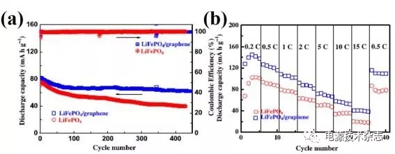 LiFePO4也是鋅基鋰電池理想的正極活性物質(zhì)。Yuan等采用水熱法合成了LiFePO4和石墨烯的復(fù)合物,并首次運(yùn)用在鋅基鋰體系中。6LiFePO4為電池提供高容量(145 mAhg-1),石墨烯為電子在正極中的傳輸提供快速遷移的通道。450圈循環(huán)后,LiFePO4/石墨烯復(fù)合正極容量保持率高達(dá)87.5%,且?guī)靷愋时3?00% (圖3a)。在15C高倍率充放電下,電池的容量為40mAhg-1,表現(xiàn)出優(yōu)異的倍率性能(圖3b)。與LiMn2O4相比,LiFePO4具有更高的理論容量和更低的工作電壓,因此在水系電池中有著光明的應(yīng)用前景。