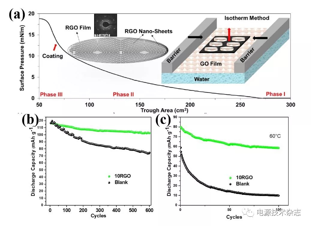 圖5(a)人工SEI膜的制備以及Langmuir-Blodgett方法中表面壓力與水槽面積的函數(shù)關(guān)系。(b,c)常溫和60°C下人工SEI膜貼附正極與空白正極的循環(huán)性能比較。