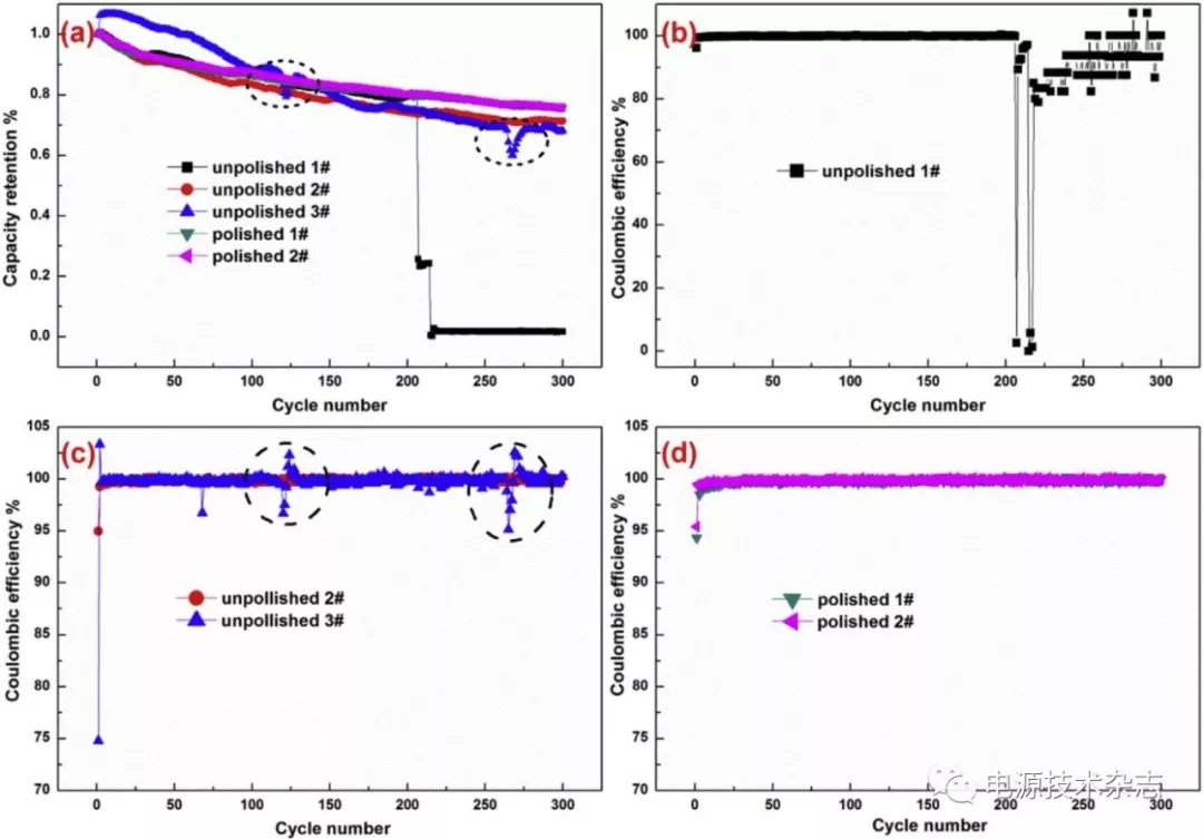 圖8 未拋光三種商用金屬鋅負(fù)極1#,2#,3#和拋光1#,2#鋅負(fù)極的循環(huán)性能(a)以及庫倫效率(b-d)