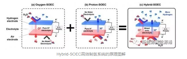 有鑒于此,他們開發(fā)出了全新的Hybrid-SOEC系統(tǒng),即借助一種混合離子導(dǎo)體、來同時傳輸負氧離子和帶電荷的氫離子(質(zhì)子),從而充分利用了固態(tài)電解槽的所有優(yōu)點、提升了制氫的效率。