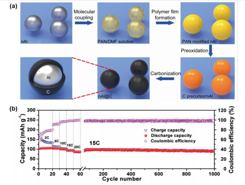 (a) 核殼結(jié)構(gòu)鋁@碳納米復(fù)合材料的設(shè)計、制備示意圖;(b)所制備雙離子電池在15C充放電速度下的長循環(huán)穩(wěn)定性曲線。