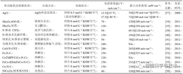 表1 一次鋅-空氣電池單功能氧還原催化劑