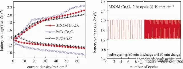 圖2 3DOM Co3O4的TEM圖及可充電鋅空電池充放電性能及循環(huán)穩(wěn)定性