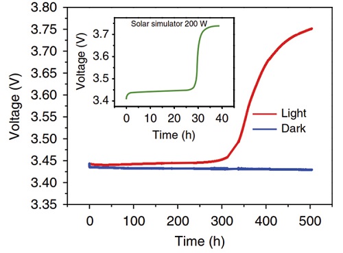 圖2:霓虹光照射(紅線)的開路電壓(OCV):在經(jīng)過平緩的3.40V后,電壓升至3.75V;在使用黑盒子的黑暗環(huán)境(藍(lán)線),電壓如預(yù)期般,在500小時(shí)內(nèi)從3.44V略降至3.41V。插圖顯示使用太陽能仿真器(綠線)照射下OCV的變化