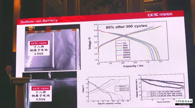 我們做了1.5 Ah和0.5 Ah兩種軟包全電池,正極材料采用前面提到的鎳錳氧化物,負(fù)極采用生物質(zhì)的硬碳材料,經(jīng)300次循環(huán)后容量衰降為15%。由此可見(jiàn),鈉離子電池用廉價(jià)材料是可以制備的,而且電性能良好。