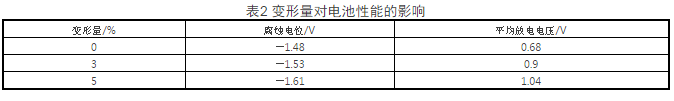 Huang等[18]研究了孿晶密度和變形量對以AZ31板材為陽極的鎂空氣電池性能的影響,組織中有孿晶的地方擁有的能量密度高,基體開始沿著孿晶加快腐蝕,電極耐腐蝕性一定程度上降低[19]。隨著變形量的增加,AZ31板材中孿晶的密度增加,電化學活性增強;并且在放電過程中陽極表面的腐蝕產(chǎn)物受孿晶的影響易脫落,電壓滯后得到減弱。AZ31鎂合金變形量為0%、3%、5%時,腐蝕電位(vs.SCE)、平均放電電壓(vs.SCE)如表2所示。