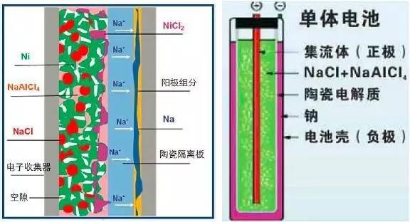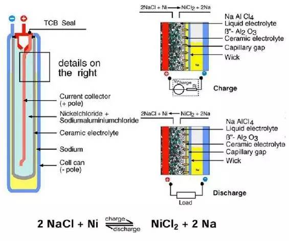 電池采用Ni粉和NaCl作為正極極原材料,NaAlCl4作為液體電解質(zhì),陶瓷管作為隔離膜,Na為負(fù)極材料。請(qǐng)注意,此處的陶瓷電解質(zhì)就是β"-Al2O3陶瓷管,與NaS電池一樣。陶瓷管內(nèi)填滿Ni粉、食鹽以及NaAlCl4的混合物,正極銅或鍍鎳銅棒作為集流體插入其中,陶瓷管與不銹鋼外殼之間為金屬Na,物料壓實(shí),頂部密封。