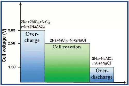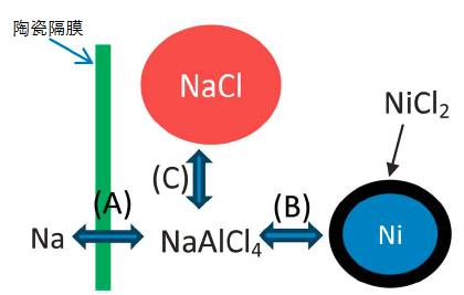 放電時(shí),正極的Ni2+得到電子,生成Ni單質(zhì),負(fù)極單質(zhì)Na失去電子,生成Na+穿過(guò)陶瓷隔離膜,與正極電解液中的Cl-結(jié)合為NaCl。電池的運(yùn)行溫度為270-350℃,開路電壓2.58V(300℃),電子轉(zhuǎn)移數(shù)為2。
