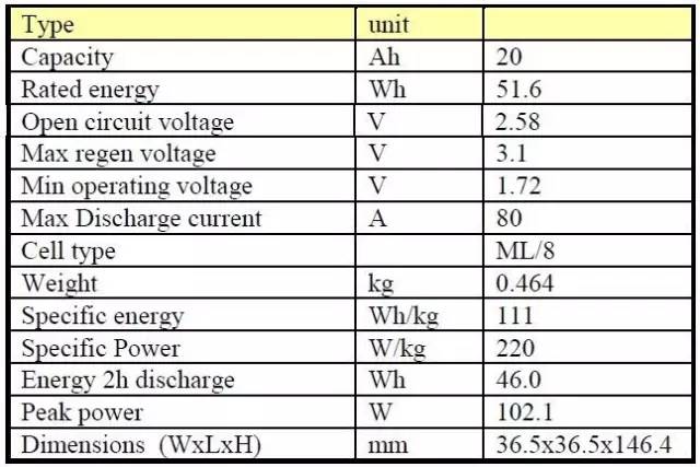 下表為FZ SoNick Z5模塊采用的ML/8電芯參數(shù),單體電壓2.58V,額定容量51.6Wh,額定20Ah,最大放電電流80A,單體重約0.5kg,比能量111Wh/kg,峰值功率102W,尺寸15cm高,3.6cm方形截面。