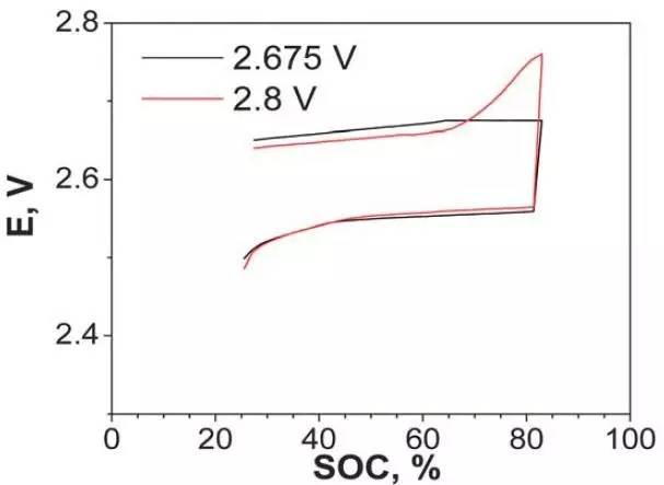 上圖顯示的是斑馬電池單體在SOC=20%~80%下的充放電曲線,紅色曲線條件為充電截止電壓2.78V,黑色為2.675V截止并浮充。無(wú)論那種情況,可以看出充放電電壓比較平坦。