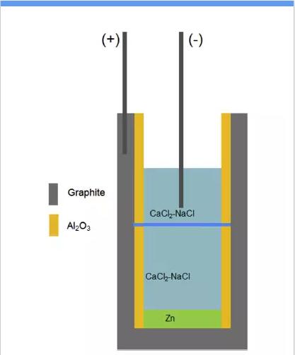 該電池包含一個石墨坩堝,一個氧化鋁絕緣桶,孔隙率為300ppi氧化鎂穩(wěn)定氧化鋯薄片,Mo金屬電流導(dǎo)線,電解液采用NaCl: CaCl2 (50:50 mol %),熔點為500℃,電池的工作溫度為560℃。首先,將鋅放置于電池的底部,并加入相應(yīng)數(shù)量的干燥NaCl: CaCl2鹽,然后該電池被移入到管式爐中,加熱到560℃,正極通過石墨引出,Mo線作為負(fù)極,將Mo線插入到熔鹽中2cm。在充電的過程中,熔鹽中的Na+還原成為Na金屬負(fù)極,而Zn被氧化成為Zn2+,進(jìn)入到熔鹽中,放電過程則剛好相反。