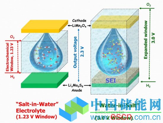 這種高濃度的鹽(接近飽和水平),意味著可以形成一個(gè)固體電解質(zhì)界面層,而最大電壓可以從1.23V提升至3V。