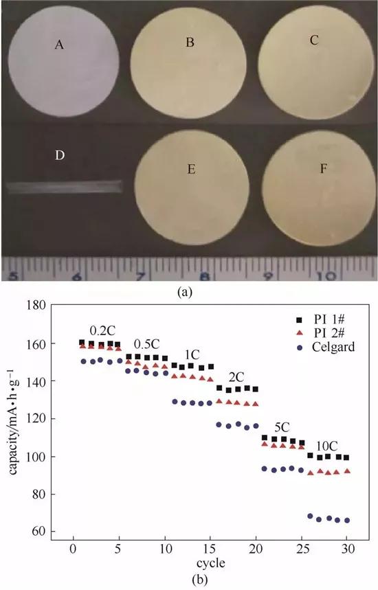 (a)Celgard、PI40μm、100μm隔膜 150℃處理前(a,b,c)后(d,e,f)熱收縮;(b)倍率測試