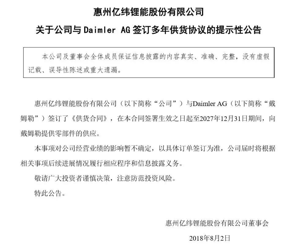 今年8月,億緯鋰能發(fā)布公告稱,公司與戴姆勒簽訂《供貨合同》,在合同簽署生效之日起至2027年12月31日期間,向戴姆勒提供零部件。公告雖未明確供貨內(nèi)容,有消息認為,從雙方主營業(yè)業(yè)務看,億緯鋰能給戴姆勒提供的很有可能是動力電池。