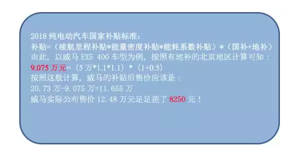 但有疑問(wèn)的是,即便按照國(guó)家補(bǔ)貼來(lái)算,威馬EX5的補(bǔ)貼后售價(jià)也與實(shí)際公布的補(bǔ)貼后售價(jià)不一致。以威馬400車型為例,按照有地補(bǔ)的北京地區(qū)市場(chǎng)價(jià)格推算,補(bǔ)貼后售價(jià)應(yīng)該是11.655萬(wàn)元,但威馬實(shí)際公布的補(bǔ)貼后售價(jià)是12.48萬(wàn)元,兩者之間相差了8250元。