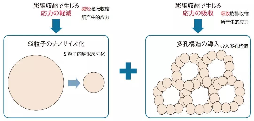 通過(guò)Si粒子的納米尺寸化以及導(dǎo)入多孔結(jié)構(gòu),緩和由于充放電的膨脹收縮導(dǎo)致的應(yīng)力變化。以上多孔結(jié)構(gòu)圖片是粗略圖像。