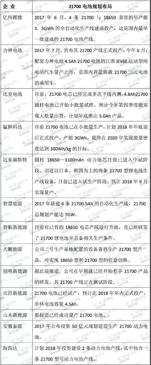 其實(shí)在特斯拉影響下,國(guó)內(nèi)電池企業(yè)早就開始了對(duì)21700電池的布局。因?yàn)榘凑罩袊?guó)政府規(guī)劃,在2020年動(dòng)力電池單體能量密度突破300Wh/kg,動(dòng)力電池系統(tǒng)能量密度達(dá)到260Wh/kg;2025年動(dòng)力電池系統(tǒng)能量密度要達(dá)到350Wh/kg,而目前21700電池正是可以達(dá)到國(guó)家能量密度規(guī)劃要求的一大“利器”。電池中國(guó)網(wǎng)梳理了目前國(guó)內(nèi)電池企業(yè)21700電池的布局狀況: