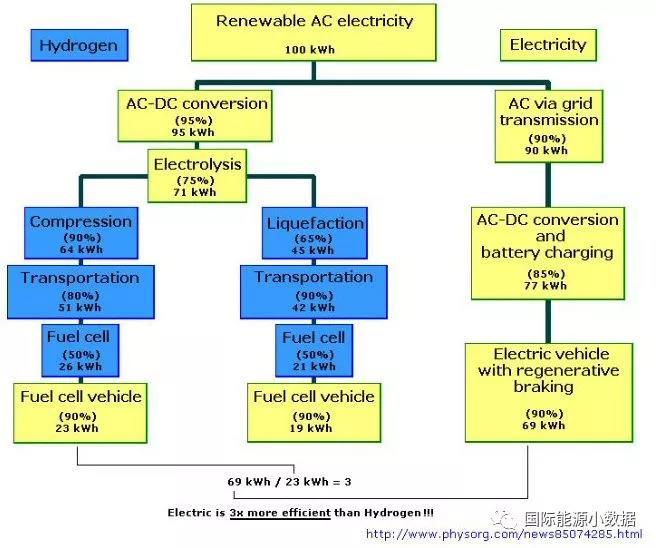 兩者相比,電動(dòng)汽車的能源轉(zhuǎn)換效率是燃料電池汽車的3倍。