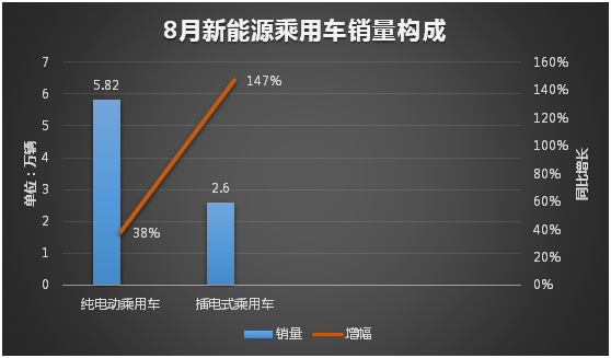 根據(jù)乘聯(lián)會(huì)數(shù)據(jù),8月,純電動(dòng)乘用車汽車銷量為5.82萬輛,同比增長(zhǎng)38%;插電式混合動(dòng)力汽車銷量約為2.6萬輛,同比增長(zhǎng)147%。