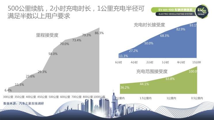 汽車之家在線調(diào)研結(jié)果顯示,500公里、2小時(shí)充電時(shí)長、1公里充電半徑能夠滿足半數(shù)以上用戶需求。更細(xì)化來看,用戶對(duì)續(xù)航里程達(dá)到500公里的車型接受度相比450公里多了將近30個(gè)百分點(diǎn);超過半數(shù)的用戶可以接受2個(gè)小時(shí)充電時(shí)長,充電范圍則需要控制在1公里內(nèi),能夠滿足63.8%用戶需求。