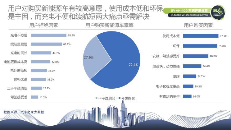 在用戶的購買因素和拒絕因素方面,使用成本低和環(huán)保是用戶愿意購買新能源車的主要因素,而用戶拒絕因素,如充電不方便、續(xù)航里程短、充電時(shí)間長等則是廠家亟需解決的痛點(diǎn)。