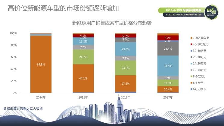 細(xì)分市場(chǎng)格局逐步形成,對(duì)應(yīng)的用戶關(guān)注價(jià)位也在隨之發(fā)生變化。從汽車之家大數(shù)據(jù)來看,新能源用戶銷售線索車型價(jià)格分布趨勢(shì)自2014年到2017年,呈現(xiàn)出高價(jià)位新能源車型市場(chǎng)份額逐漸增加的現(xiàn)象,并強(qiáng)勢(shì)的將原有的低價(jià)位市場(chǎng)份額逐年稀釋。