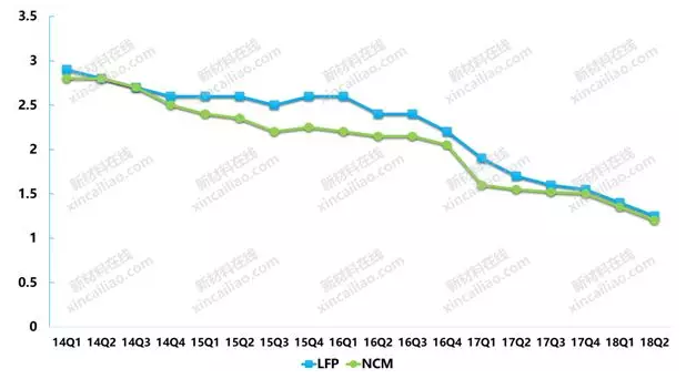 2016年至今的電池價(jià)格經(jīng)歷了幅度較大的下滑,2018年第二季度,三元電池平均價(jià)格為1.2元,同比下滑了44%。