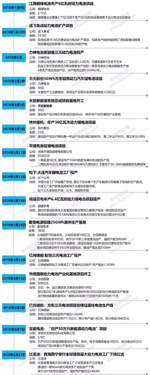 2018年上半年,鋰電企業(yè)相關(guān)企業(yè)開始紛紛投資建設(shè)生產(chǎn)線,擴(kuò)大生產(chǎn)產(chǎn)能,布局鋰電產(chǎn)業(yè)。