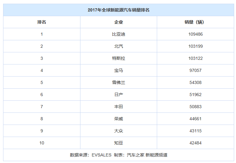 2、中國(guó)新能源汽車(chē)市場(chǎng)初顯規(guī)模化效應(yīng)。2017年,全球共有三家企業(yè)新能源汽車(chē)銷(xiāo)量超過(guò)10萬(wàn)輛,中國(guó)占兩家,分別是比亞迪和北汽新能源。