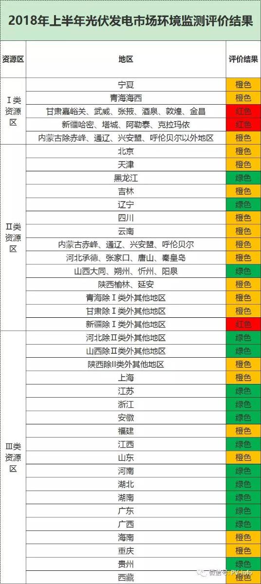 2018年9月10日,國家可再生能源信息管理中心發(fā)布《關于發(fā)布2018年上半年光伏發(fā)電市場環(huán)境監(jiān)測評價結果的通知》,一類地區(qū)的甘肅嘉峪關、武威、張掖、酒泉、敦煌、金昌以及新疆為紅色。