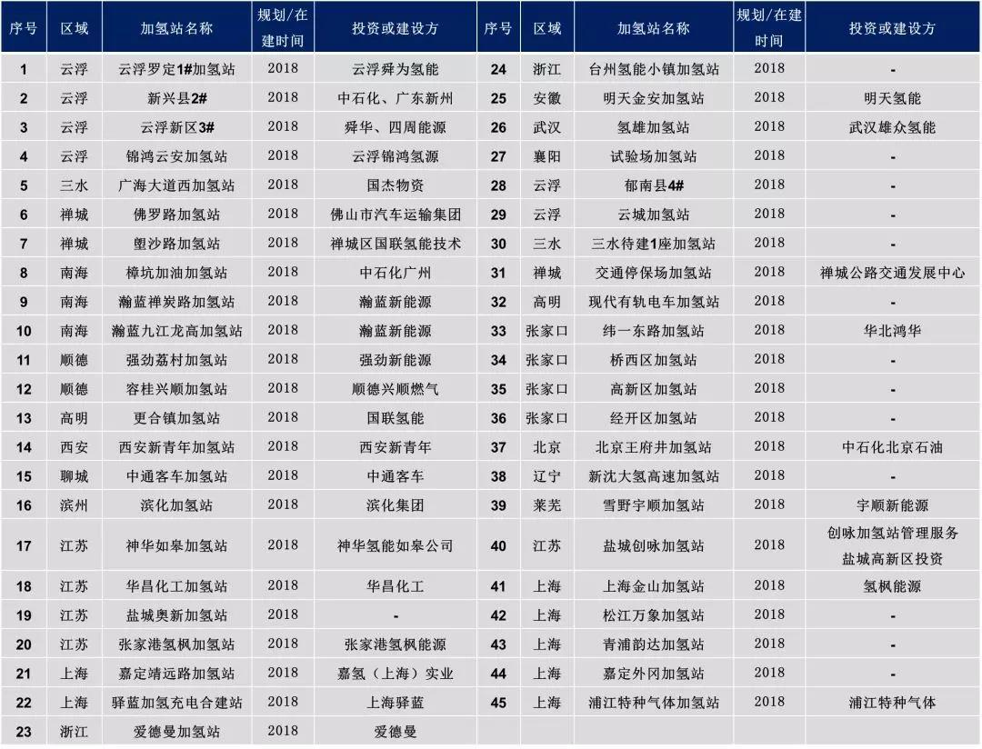 截止2018年8月,國內(nèi)在建和規(guī)劃建設(shè)的加氫站有45座: