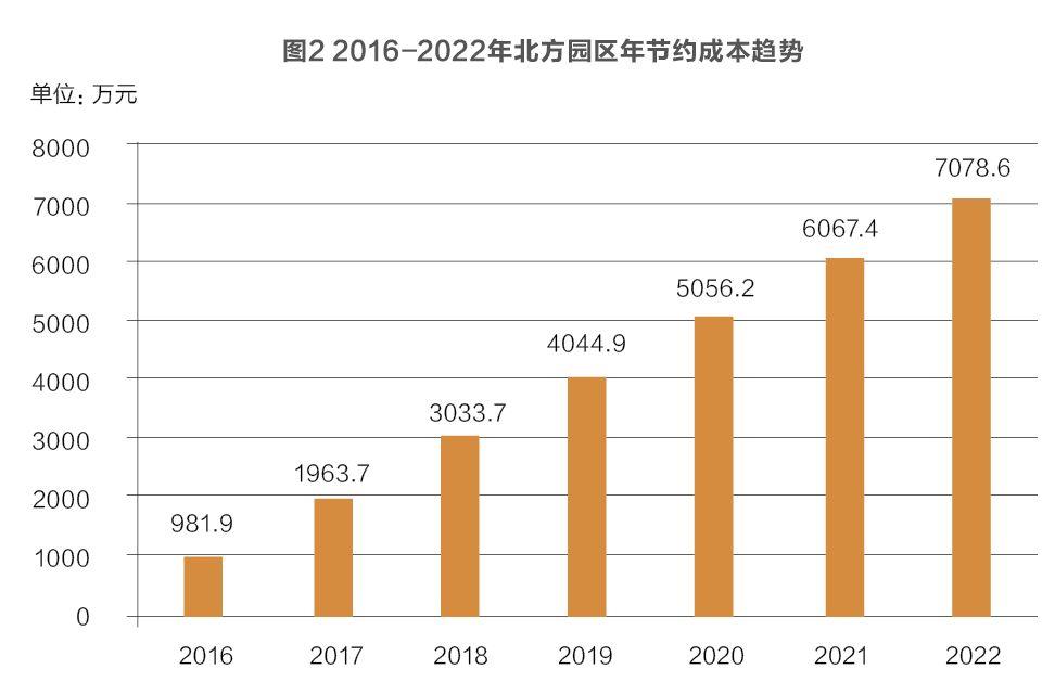 從節(jié)約成本角度看,按目前國網(wǎng)客服中心北方園區(qū)能源系統(tǒng)試運行數(shù)據(jù)計算,北方園區(qū)每年累計節(jié)約電量約1100.2萬千瓦時,年節(jié)約電費共計987.7萬元,預(yù)計到2020年將節(jié)約5056.2萬元,2022年節(jié)約7078.6萬元,具體見圖2。