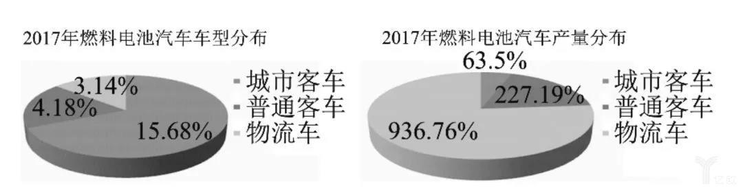 十三五開始后,國(guó)內(nèi)更多商用車企業(yè)涉足氫燃料電池商用車開發(fā),近年來(lái)已初步具備小批量生產(chǎn)能力。據(jù)統(tǒng)計(jì),2017 年全國(guó)共有 10 家車企的22 款燃料電池商用車進(jìn)入當(dāng)年新發(fā)布的推薦目錄,車型款數(shù)最多為城市客車。2017 年全國(guó)燃料電池商用車產(chǎn)量為 1226 輛,其中產(chǎn)量最大車型為物流車,物流車產(chǎn)量最大企業(yè)為東風(fēng)公司,普通客車產(chǎn)量最大企業(yè)為上汽大通,公交客車產(chǎn)量最大企業(yè)為佛山飛馳,如圖 1 所示。