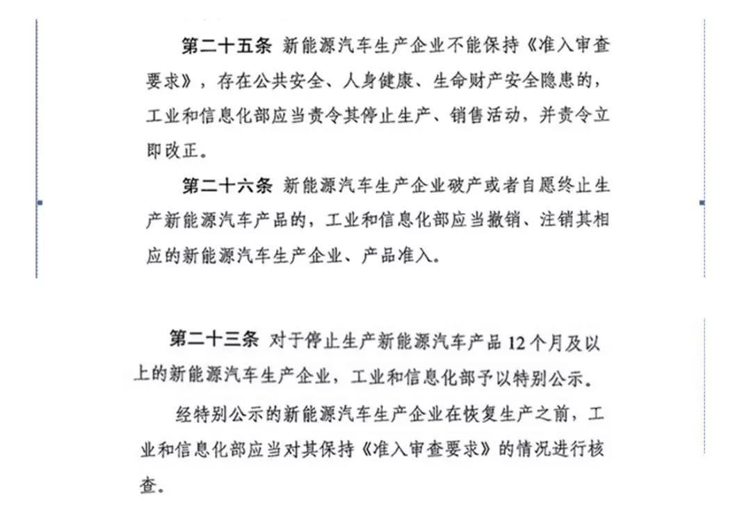 事實(shí)上,本次《通知》發(fā)布的依據(jù)是工信部2017年1月17日發(fā)布的《新能源汽車生產(chǎn)企業(yè)及產(chǎn)品準(zhǔn)入管理規(guī)定》。其中,第二十三條明確指出:“對(duì)于停止生產(chǎn)新能源汽車產(chǎn)品12個(gè)月及以上的新能源汽車生產(chǎn)企業(yè),工業(yè)和信息化部予以特別公示。經(jīng)特別公示的新能源汽車生產(chǎn)企業(yè)在恢復(fù)生產(chǎn)之前,工業(yè)和信息化部應(yīng)當(dāng)對(duì)其保持《準(zhǔn)入審查要求》的情況進(jìn)行核查?!?
