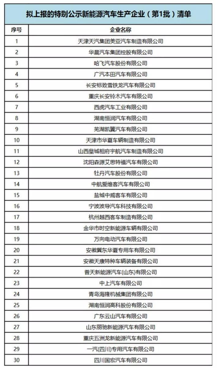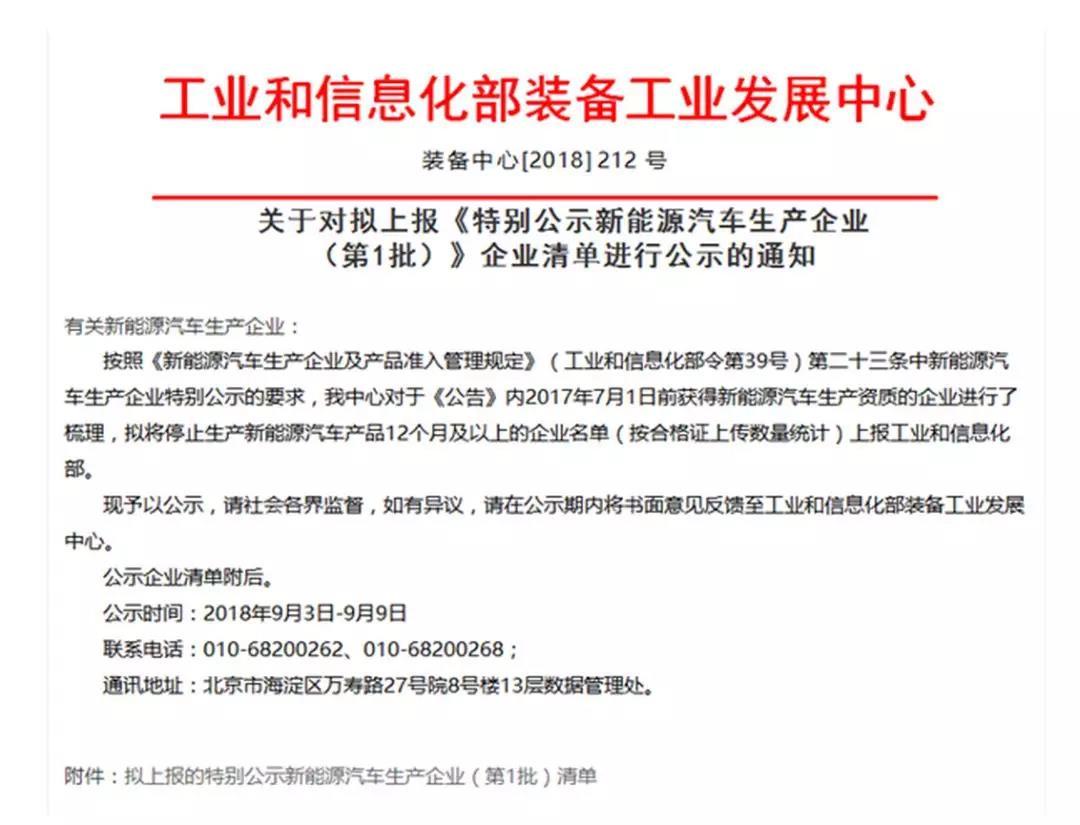 中國(guó)儲(chǔ)能網(wǎng)訊:9月3日,工業(yè)和信息化部裝備工業(yè)發(fā)展中心發(fā)布了一則“關(guān)于對(duì)擬上報(bào)《特別公示新能源汽車生產(chǎn)企業(yè)(第1批)》企業(yè)清單進(jìn)行公示的通知”(以下簡(jiǎn)稱《通知》),對(duì)于《公告》內(nèi)2017年7月1日前獲得新能源汽車生產(chǎn)資質(zhì)的企業(yè)進(jìn)行了梳理,對(duì)停止生產(chǎn)新能源汽車產(chǎn)品12個(gè)月及以上的30家企業(yè)在9月3日-9月9日期間進(jìn)行公示,如企業(yè)在公示期內(nèi)未將書面意見(jiàn)反饋,將上報(bào)至工業(yè)和信息化部。