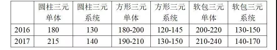 經(jīng)過一段時間的發(fā)展,磷酸鐵鋰和三元鋰電池的技術水平得到明顯提升。在成本方面,磷酸鐵鋰電池組價格從2017年年初的1.8-1.9元/Wh下降到年底的1.45-1.55元/Wh。三元動力電池包價格從年初的1.7-1.8元/Wh下降到年底的1.4-1.5元/Wh。