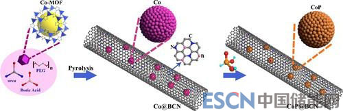 硼氮共摻雜石墨烯納米管包覆磷化鈷納米顆粒復(fù)合結(jié)構(gòu)合成示意圖